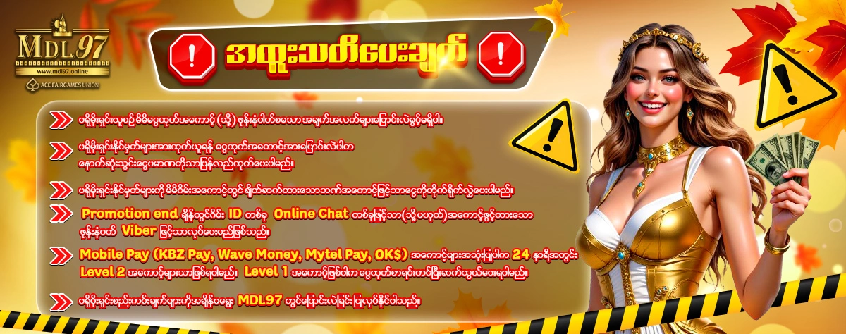 ⚠️အေၾကာင္းအမ်ိဳးမ်ိဳးေၾကာင့္ Promtion ႏိုင္ေငြအားေငြထုတ္ခ်ိန္တြင္ ေငြထုတ္ပယ္ဖ်က္ခံရပါက MDL97 Customer Service သို႔ဆက္သြယ္အေၾကာင္းၾကားေပးရမည္။ မဆက္သြယ္ဘဲ ပ႐ိုမိုးရွင္းႏိုင္မွတ္ျဖင့္ဆက္ကစားၿပီး ေငြထုတ္ပါက Promotion end ခ်ိန္ရွိသည့္အမွတ္သာထုတ္ေပးမည္။