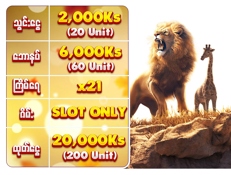 C တနလၤာေန႔ - ေသာၾကာေန႔ အထိ ႐ိုး႐ိုးစုစုေပါင္း သြင္းေငြ (ပ႐ိုမိုးရွင္းမယူေသာေငြ ) 2,500,000 က်ပ္ ( 25,000 မွတ္ ) ျပည့္ စေန (သို႔) တနဂၤေႏြ ဖရီး 100,000 က်ပ္ နဲ႔ 60,000 က်ပ္ 2 မ်ိဳးစလုံးယူႏိုင္