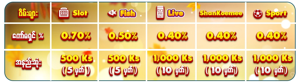 (SLot / Fish / Live / Sport /Shan Koe Mee ) ႐ိုး႐ိုးသြင္းေသာေငြတို႔၏ Coin in မ်ားကိုသာတြက္ခ်က္မည္။